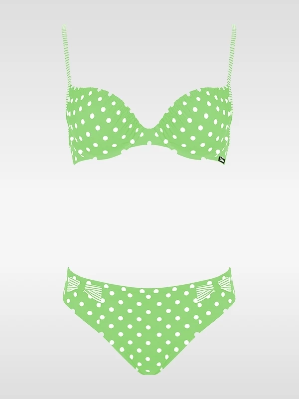 Die fröhliche Kombination von Micro-Streifen und süßen Tupfen ist ein Trendthema, bei dem Schleifen-Zierelemente die Eyecatcher sind. Logo-Patches, kontrastfarbene Bikiniverschlüsse oder Bügelbahnen setzen besondere Akzente.