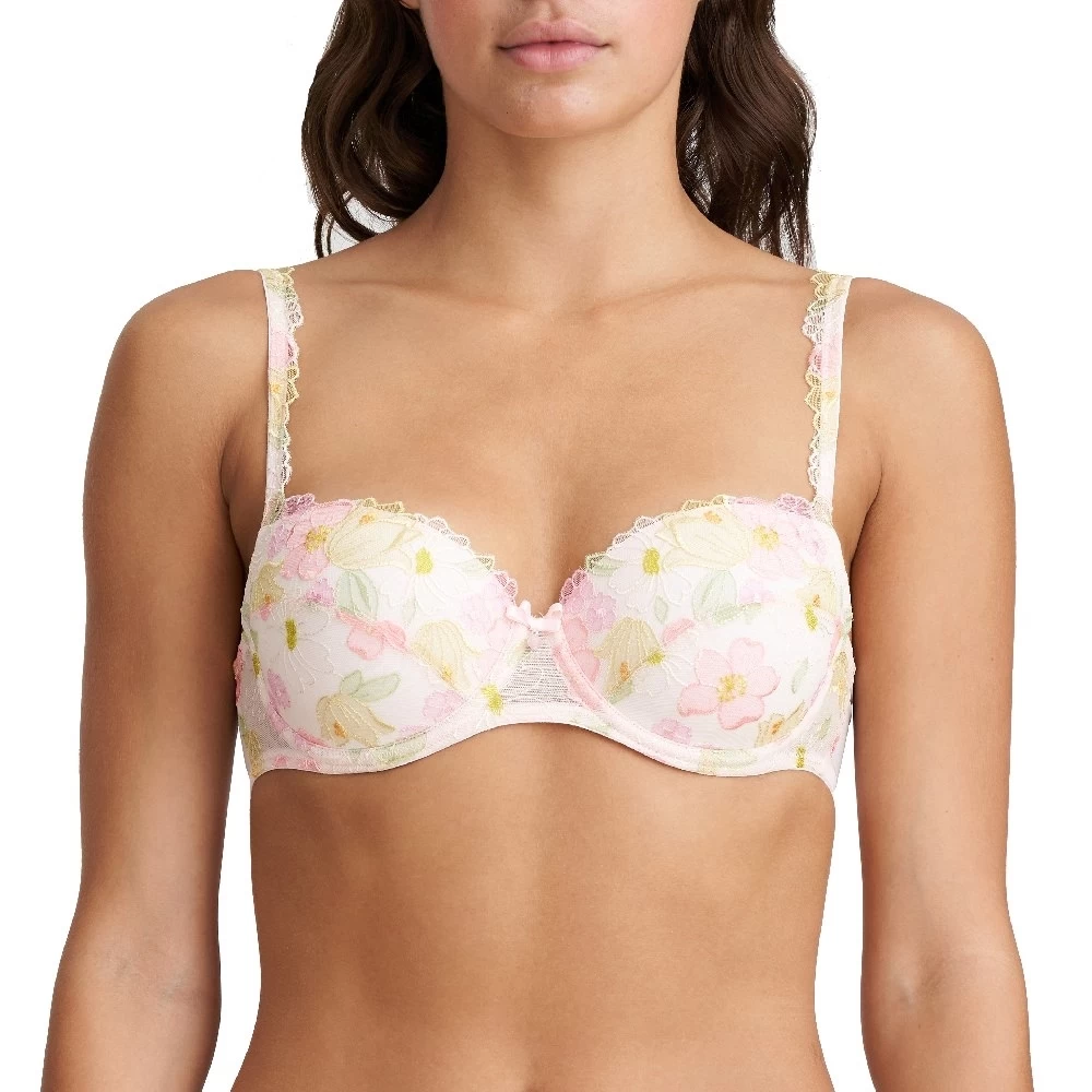 Dieser anmutige Balconette-BH mit gepolsterten Cups strahlt Eleganz aus. Die Cups sind üppig mit Blumenstickerei in Aquarelltönen verziert. Auch die Träger sind mit der zarten Stickerei besetzt.