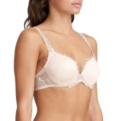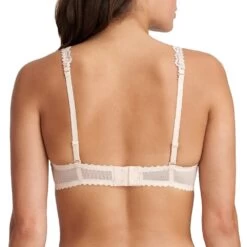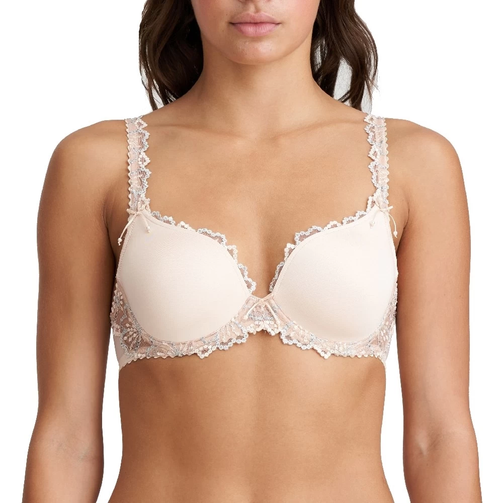 Das Dekolleté des BHs mit gepolsterten Cups ist herzförmig. Der Cup ist in der Mitte tief ausgeschnitten und geht seitlich höher, sodass er die Wölbung des Busens umschließt. Der obere Rand ist mit feiner Stickerei versehen, die gewährleistet, dass sich der BH ansprechend an Ihre Rundungen schmiegt.