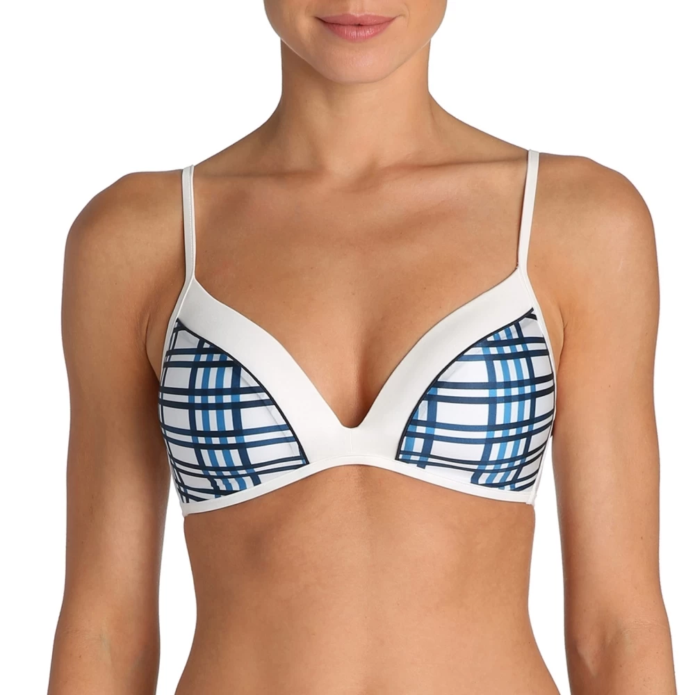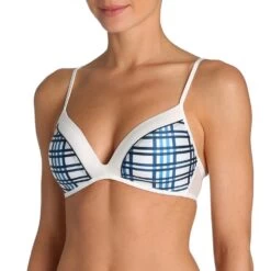 Dieses Modell mit Karoprintmuster am Cup mixt den hippen Triangel-Look mit dem Komfort und Halt, den vorgeformte Cups gewähren. Ohne Bügel, daher ein Hauch frivoler. Karos in kessem Blau auf klassischem Untergrund in Natur … schlicht edel!