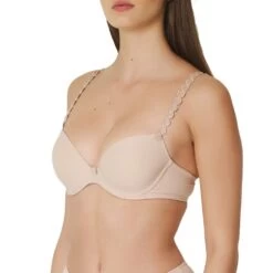 Der unterlegte BH mit runder Form besitzt einen tiefen Ausschnitt, der vom tiefsten Punkt zwischen den Brüsten fast gerade seitlich höher verläuft. Die Träger lassen sich sowohl gerade als auch um den Hals tragen. Caffe Latte ist eine moderne Variante von Nude. Raffiniert und elegant.