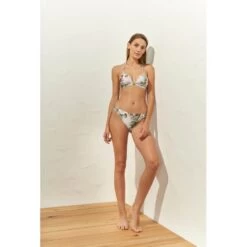 Triangel-Bikini mit leichtem Push-up-Effekt. Am Steg hat das Oberteil eine raffinierte Zierschleife. Die anmutigen Träger können gerade oder als Neckholder-Modell getragen werden. Der Bikini hat einen einfachen und eleganten Verschluss am Rücken.