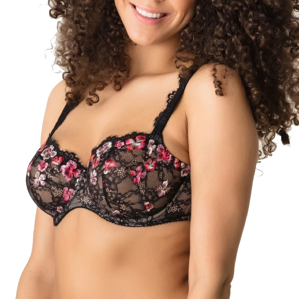 Besonders luxuriöser Balconette-BH aus blickdichter reiner Spitze und mit farbenfroher Stickerei versehen. Von den Obercups bis hin zu den Trägern läuft sexy Wimpernspitze, die an den Schultern mit besonders