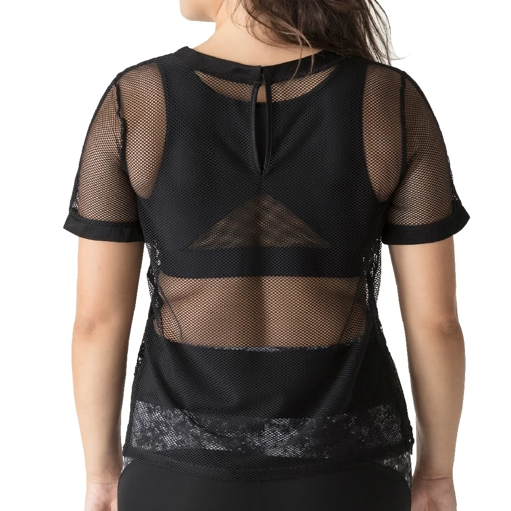 T-Shirt aus transparentem Netzmaterial mit Spitzeneinsätzen an den Seiten. An der Rückseite glänzt ein silberfarbener Verschluss. Das T-Shirt eignet sich als Strandaccessoire, Sporttop oder modisches Sommertop über Ihren Dessous.