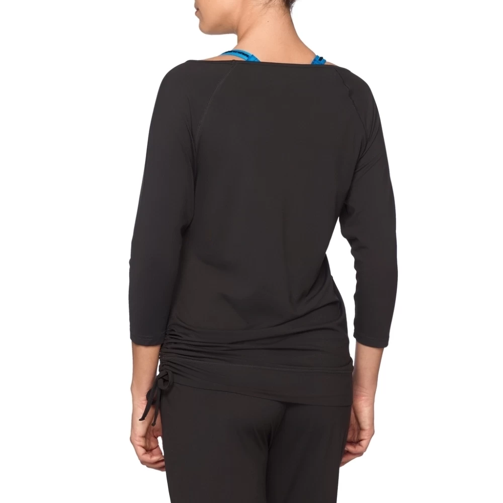 Yoga-Top mit reizvollen dreiviertellangen Ärmeln und breitem Halsausschnitt. Der modische Print mit Rasterstruktur läuft weiter nach unten. Der Stretchstoff fällt weich; lässt sich unten zusammenfassen. Mit dreiviertellangen Ärmeln sehen die Oberarme schlanker aus. Der weich fallende Stoff sitzt besonders vorteilhaft an Taille und Bauch. Bedeckt den Po.