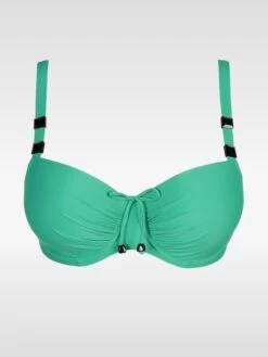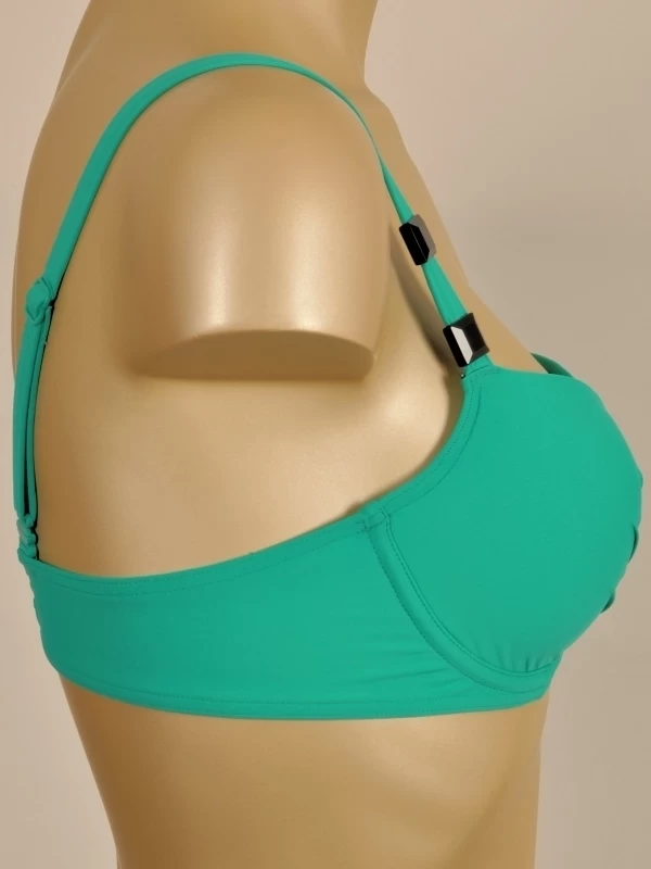 Stilvolles Bikini-Oberteil mit Bügel-BH, aus einem luxuriösen Drapeestoff gefertigt. Die eleganten Spaghettibändchen und der edelsteinähnliche Schmuck steigern die überaus schicke Ausstrahlung noch. Die Höhe des Obercups können Sie selbst mit Hilfe der Schleife am Steg und an den Bändchen einstellen.