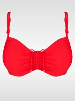 Stilvolles Bikini-Oberteil mit Bügel-BH, aus einem luxuriösen Drapeestoff gefertigt. Die eleganten Spaghettibändchen und der edelsteinähnliche Schmuck steigern die überaus schicke Ausstrahlung noch. Die Höhe des Obercups können Sie selbst mit Hilfe der Schleife am Steg und an den Bändchen einstellen. Der eingearbeitete Bügel-BH aus fester Mikrofaser verleiht dem Busen eine schöne, volle Form. Der Drapee verhüllt etwaige Schönheitsfehler. Mit der Schleife am Steg machen Sie die Oberweite und die Cuphöhe passend.