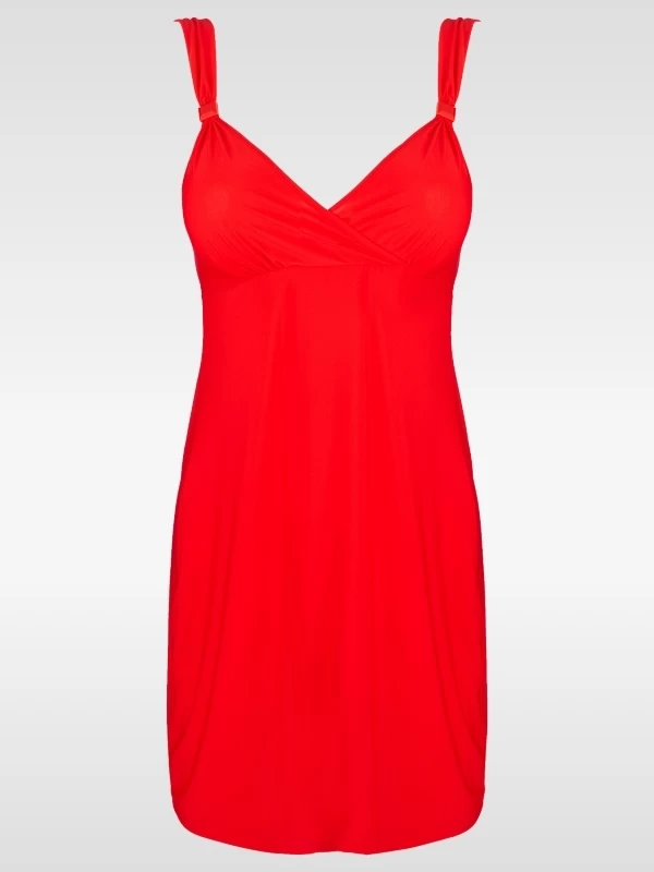 Strandkleid aus hauchdünnem Stoff, dass auch als elegantes Sommerkleid getragen werden kann. Das zierliche Drapee und die feinen edelsteinähnlichen Elemente an den Bändchen betonen den raffinierten Look dieses Designs.