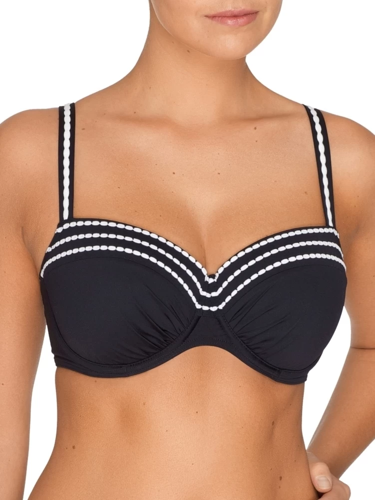 Sexy Bikini-Oberteil mit Bandeau-Ausschnitt mit unterlegten Cups. Das weiße Motiv an den Cups setzt ein volles Dekolleté extra in Szene: umwerfend feminin im Retro-Trend. Die Träger lassen sich verstellen und auch um den Nacken legen. Die weichen unterlegten Cups sitzen bequem und heben den Busen gleichzeitig. Die tief ausgeschnittenen Cups mit eingearbeitetem Grafikmotiv oberhalb – kreieren ein sexy Design. Die mit Stretch gefertigten Träger heben den Busen zusätzlich.