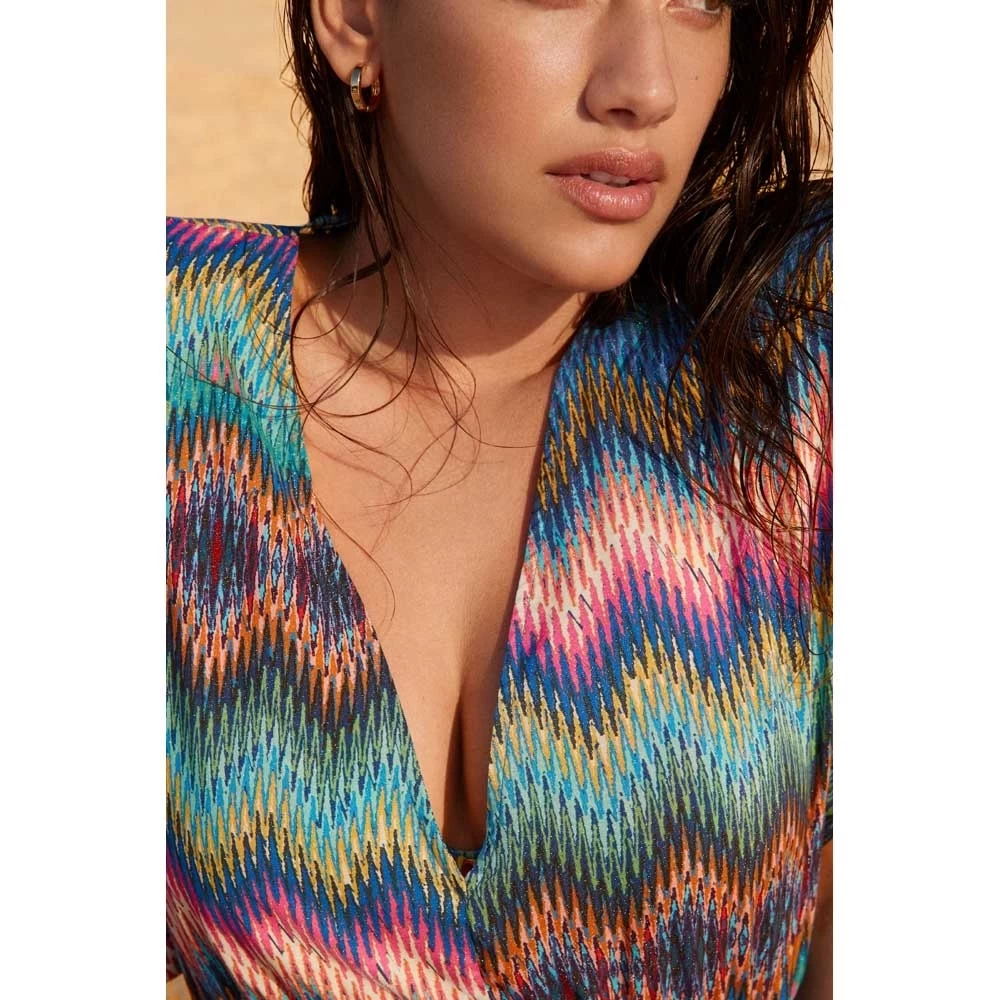 Die kurzen Ärmel bedecken elegant Ihre Schultern und Oberarme, während der tiefe V-Ausschnitt an Vorder- und Rückseite eine feminine Silhouette zaubert.