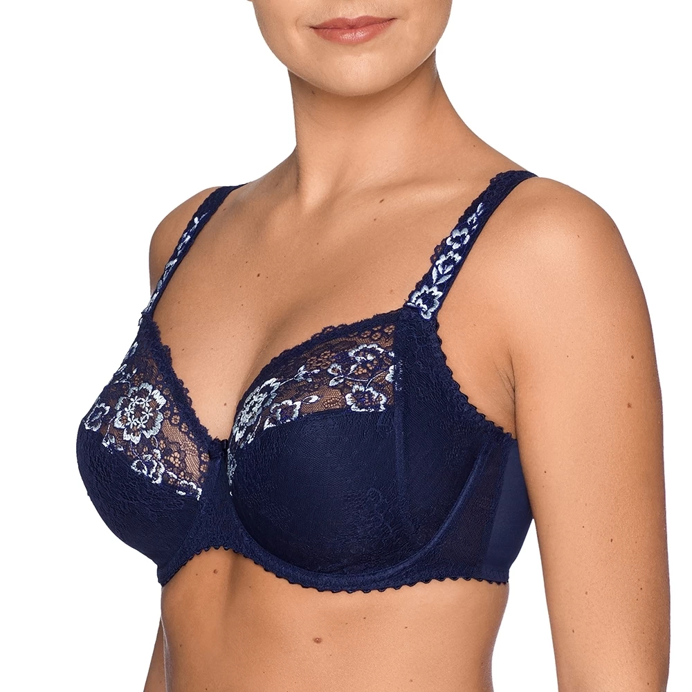 Neu bei PrimaDonna: überaus luxuriöser dreiteiliger BH mit All-over-Spitze und einer zierlich gestickten Blumengirlande. Für die ultimativ feminine Note ist dieses BH-Modell mit Spitze und einer Blumenstickerei verziert. Die Cups heben den Busen. Durch den Einsatz von Seitenteilen wird er zudem zentriert.
